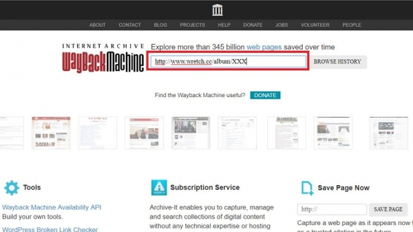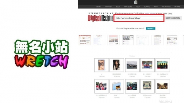 首先進入https://archive.org/web/網頁,接著在上方打上無名相簿連結,輸入「http://www.wretch.cc/album/XXX 」(XXX是你的帳號)