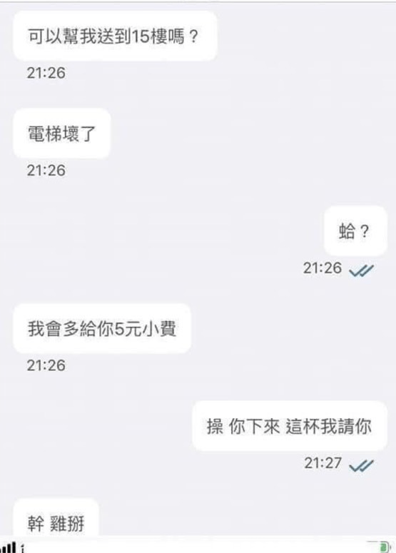 近日一張外送員與顧客的對話截圖在網路瘋傳,兩人因電梯壞了,為了要不要爬15樓而互相嗆聲,一來一往有趣的對話讓不少網友笑翻。