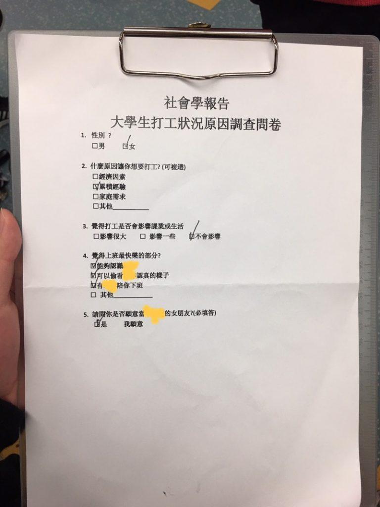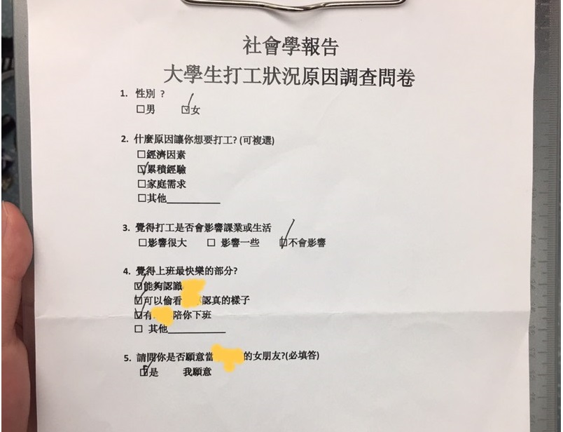 問卷上雖打著「社會學報告」,但題目只有五題,前面問題都還算正常,但到第四題就開始歪樓,題目上寫著「覺得上班最快樂的部分?」,選項都跟曖昧對象有關,分別是能夠認識OOO、可以偷看OOO認真的樣子、有OOO陪你下班。最後第五題更是讓人小鹿亂撞,「請問你是否願意當OOO的女朋友?(必填答)」,而選項只有「是,我願意」。