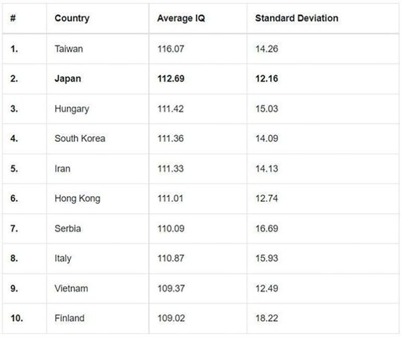 Wiqtcom「全球智商測試」針對100多個國家進行,最終公布平均智商最高國家排名。結果顯示,台灣成了最聰明的國家,其次依序為日本、匈牙利(111.42)、韓國(111.36)、伊朗(111.33),第六至十名則為香港、塞爾維亞、義大利、越南與芬蘭。