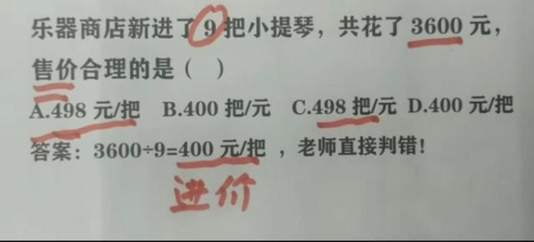 這道數學題目是:一商店進了9把小提琴,一共花費了3600元,合理的售價是多少呢?莉莉反覆看這道題很迷惑,懷疑老師是誤判了,準備到學校跟質問老師!