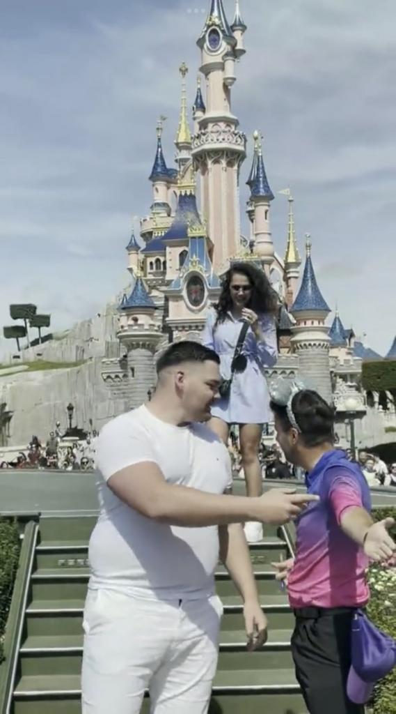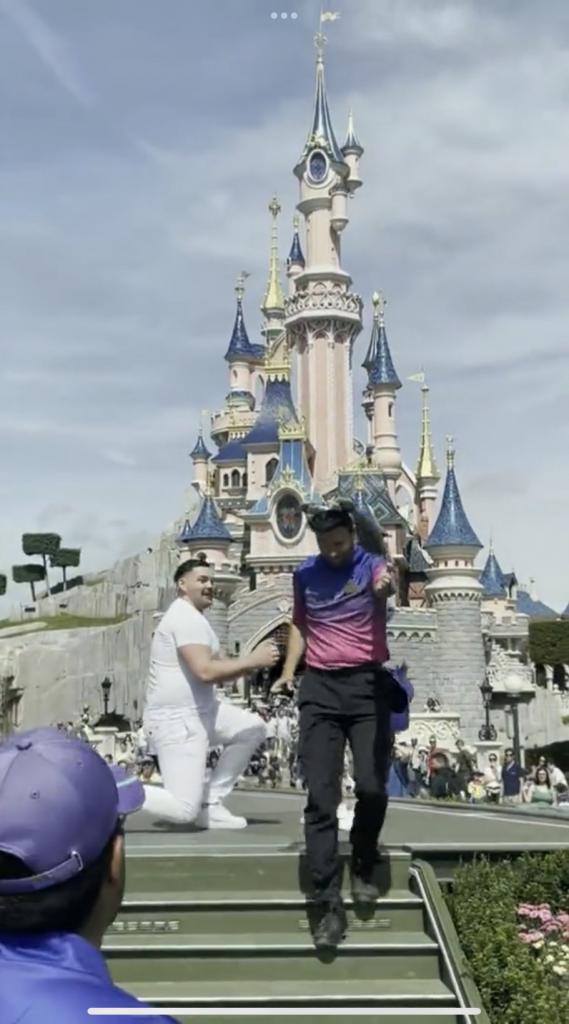 日前一段情侶於法國巴黎迪士尼求婚的影片於網上瘋傳,畫面中可見,穿著一身白的男子,在城堡前的舞台上單膝下跪,從口袋中拿出戒指盒,作勢來場浪漫求婚!不過,感人的畫面維持不到幾秒,突然衝出了一位戴著米老鼠髮箍的工作人員,一手搶走了男子手上的婚戒盒,並請該情侶立刻下台,正要求婚的男子一臉茫然的走下台,女方甚至還沒答應求婚,冷場瞬間全被網友紀錄下來。