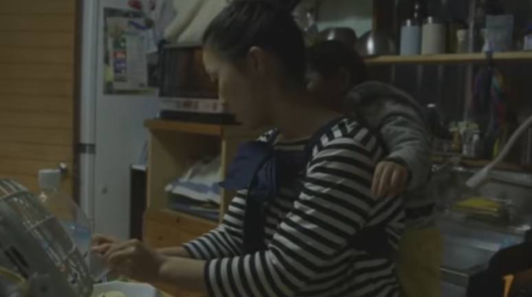 回到家中,似乎也沒有休息,忙碌了起來,為了空出手來做事,把小孩綁在了身後,收拾廚房,準備晚餐!