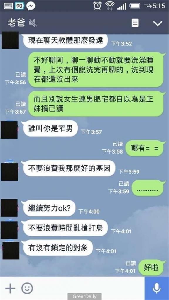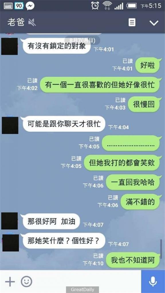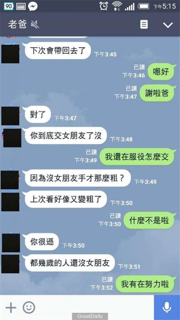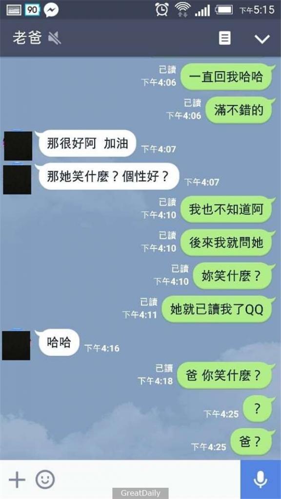 一兩個月才回臺灣一趟,平時沒事就是看書和幫家人買東西,最近他換智慧型手機學會用Line後,就三不五時找原PO媽聊天,原PO偶爾也會跟他閑聊,但今天老爸聊天內容好像不斷發動 暴 擊 ,我懷疑他一定是太悶了……