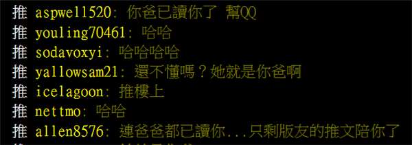 看到這些回應原PO也補了後記:「回來看到居然被推翻了@@小聲說其實老爸本人比較嚴肅講話又有點大聲,原PO在下小時候還滿怕他的,不過後來有祝他父親節快樂了,也會持續努力der!!!對了,手臂沒很粗……只是他偶爾回來會覺得有差別…」