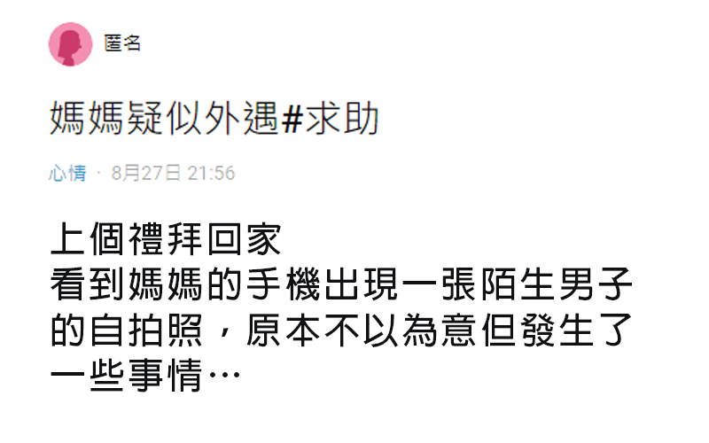 近日一名網友在Dcard心情版上發文透露,媽媽最近的行為很 反 常,先是手機出現一名陌生男子的照片、對爸爸很不 耐 煩,甚至把錢匯到陌生帳號,疑似是 遭 遇 到愛情 詐 騙,原PO緊張的向網友求助。此貼文一出,立刻引起熱議。