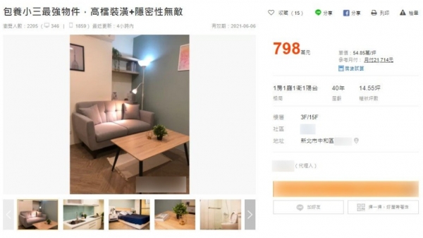 根據購屋網站資訊,這間位於新北市中和區的15樓電梯公寓,格於1房1廳1衛1陽台,每坪單價54.85萬,權狀坪數共14.55坪,總價798萬元,雖然屋齡已有40年,但裝潢相當高檔,且查詢該網站實價登錄資料,去年12月與今年1月都有成交紀錄。