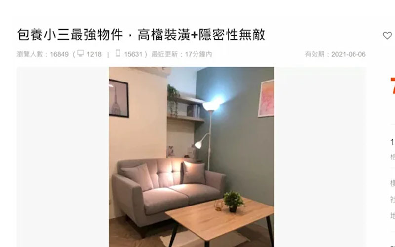 這名賣家在屋況特色中寫道「3A級養 小三專屬物件就是這間!」