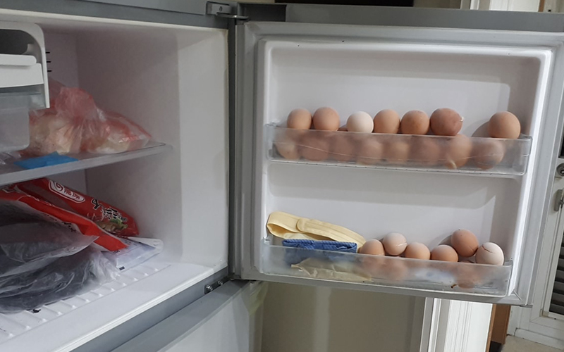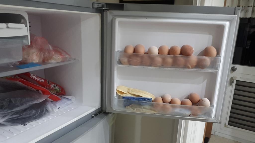 從男網友的照片可以看到,冷凍庫裡有約23顆黃雞蛋,有的外殼甚至已經裂掉了。