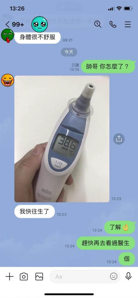一位女網友在臉書社團發文表示,男友店裡的一名新進員工,才上班三天就請了兩天假,之後人沒到班也不接電話,隔了段時間才回覆訊息,告知身體 有 恙要請假,附了張「38.6℃」的耳溫照,表示自己燒到「快 往 生」了。原PO覺得這張照片似乎越看越眼熟,一查果然是網路上流傳舊照,忍不住發怒批評「要裝也裝得像一點,去買個溫度計插在熱水很難嗎?」