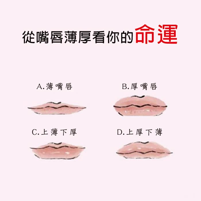 人臉上的五官對人生的影響非常重大,有句俗話叫「相由心生」,你的心善與否也許會影響你的長相,而五官中的嘴唇對面相的影響也非常重大,不同的嘴唇有著不同的運勢,從以下四種薄厚、形狀都不相同的嘴唇,找出最符合你嘴唇的一個,就能知道你是享福命還是吃苦命。