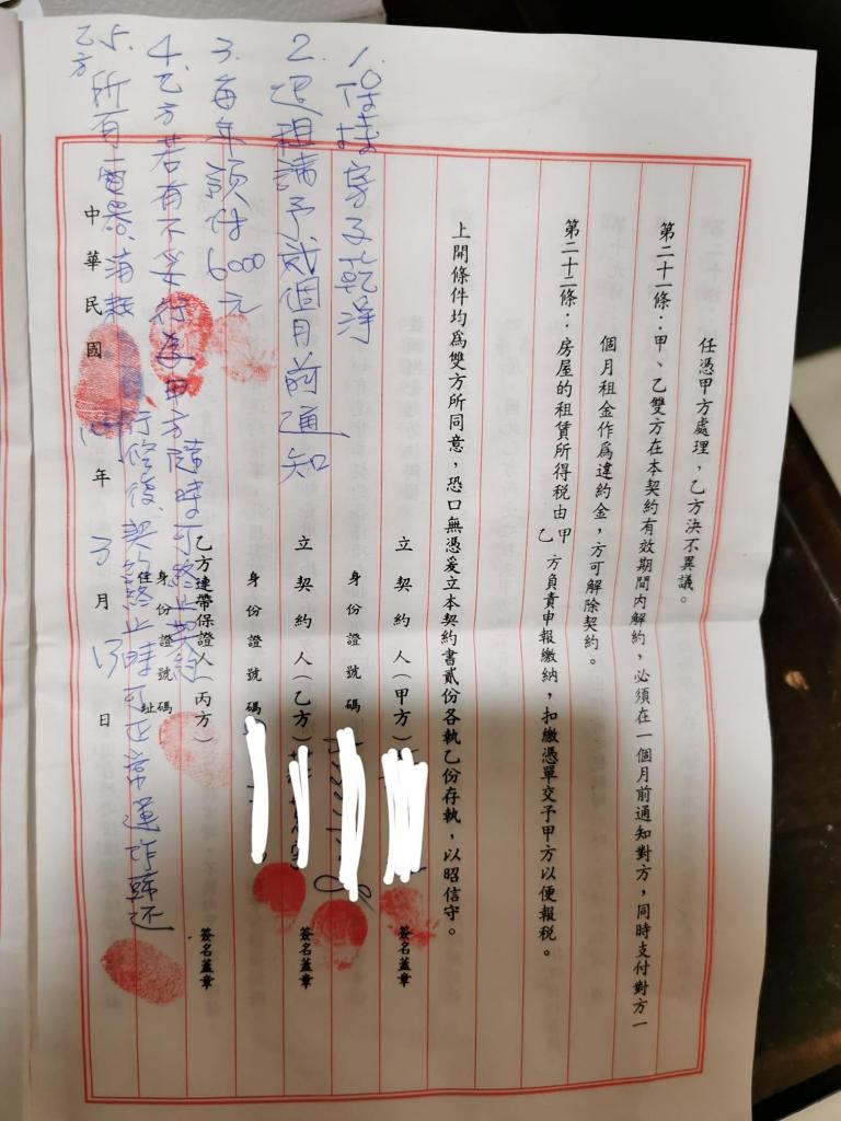 但是住了大概1個多月後,房東突然在合約上手寫上幾筆要求我補簽,同住我也沒辦法說不要,大概最大影響的內容有:
