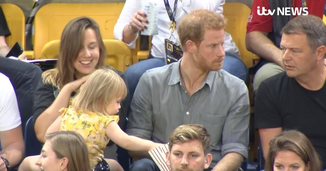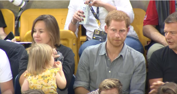 哈里王子帶著爆米花來看比賽,他與友人一坐下就開始聊天,沒想到一旁的小女孩艾米莉(Emily Henson)發現了他手上的爆米花,