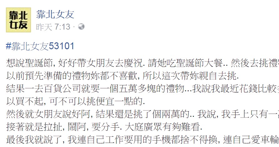 「我男朋友要是說給我一萬挑禮物,我可能會爽到明年聖誕節」「帶我吧 我一碗滷肉飯就可以了」「真的很不懂那些在嗆男方裝闊的是什麼想法,就好好的一番心意也可以被他們講成那樣真的很無言,也對啦,我們不像你們那些靠爸族每個月拿老爸幾萬的零用錢可以花,我們靠自己辛辛苦苦賺的錢想說給女友買個禮物也要被你們ㄎㄅ,明明就是女方自己太白目想買更貴的,不給又在那邊吵吵鬧鬧,不然你們就接受那些敗家女吧,只不過你老爸同不同意我是不知道啦」