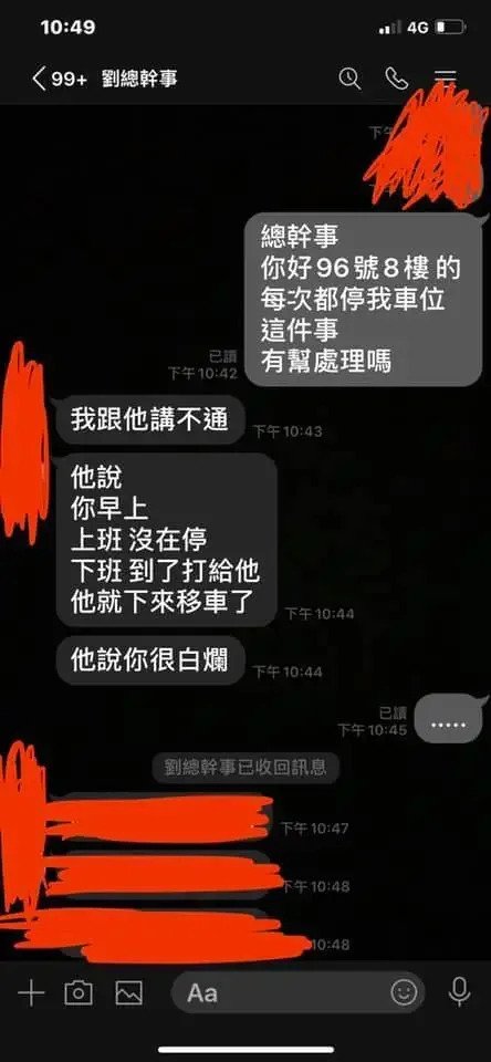 一名網友在臉書貼出一段對話,他向總幹事提到,「x號8樓的每次都停我的車位,這件事有辦法處理嗎」,原想向總幹事求助鄰居亂停車的問題,沒想到總幹事見他請求卻回「我跟他講不通」,甚至轉達對方的話表示,「他說你早上上班沒在停,下班到了打給他,他就會來移車」,不過更令原po傻眼的是最後總幹事竟吐出對方真話,「他說你很白爛」,讓他看了直呼「壞鄰居正常發揮中」。