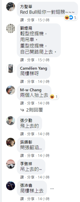 照片曝光後,引發網友熱議,紛紛留言笑說「坐電梯上去的啊」、「應該是爬樓梯上去的」、「搭直升機上去的」、「拆零件一個一個搬上去組起來的」、「當然是工人合力抬上去啊」。