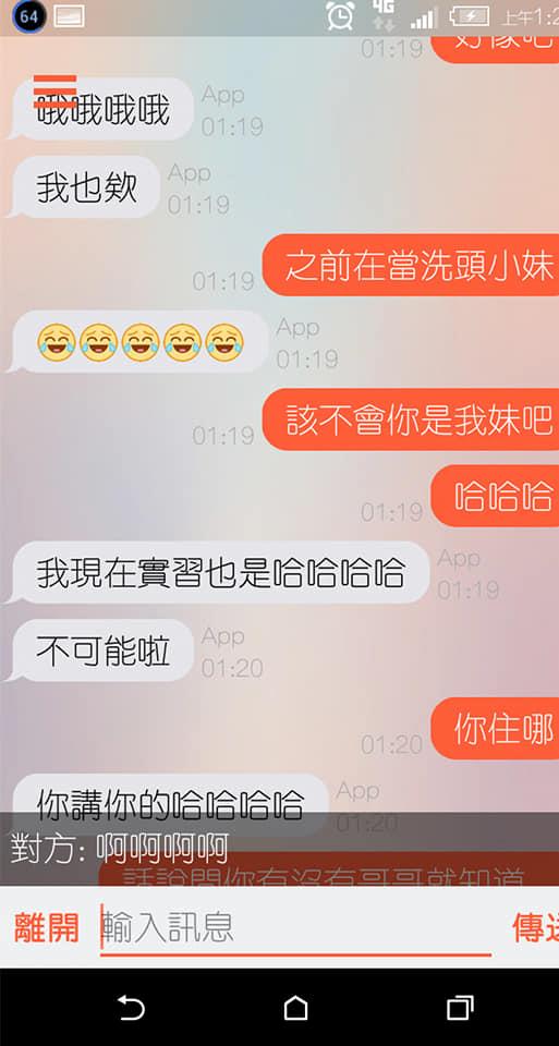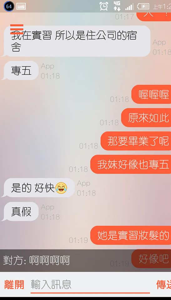一開始聊天時,剛好也提到自己有妹妹,而且也是讀五專美髮科,結果沒想到方居然也說自己也是同樣科系,然後又發現好想連家庭成員都一樣,於是原po半開玩笑的認親「該不會你是我妹吧!」沒想到對方似乎也有所感,因為對方表示自己哥哥讀逢甲,居然跟原po同一間學校,還同樣是大四,這時雙方尷尬了,結果原po還問了「妳胖嗎?」「香菇頭」「戴眼鏡」,似乎是想求證是否就是妹妹。最後兩人乾脆開誠佈公地互報姓名,結果,同時打上自己的名字,還真的是兄妹!