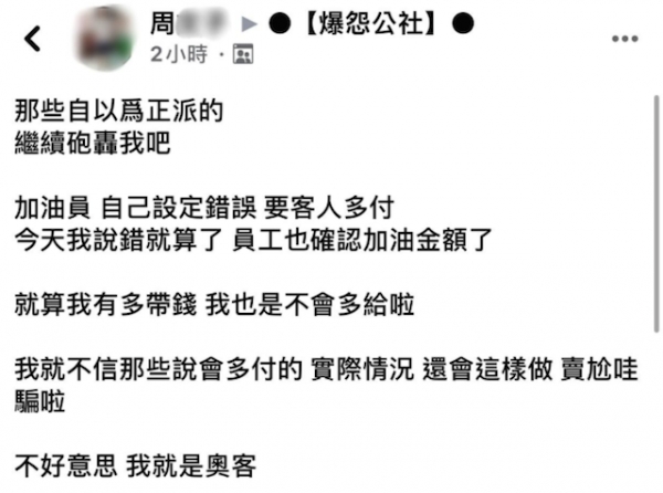 眼見大家一陣批評,原PO終於忍不住更新了貼文,「如果今天是我說錯就算了,但員工已經確認過加油金額,卻還是出錯,就算我有多帶錢,也是不會多給啦」,他甚至賭氣說「不好意思,我就是奧客!」