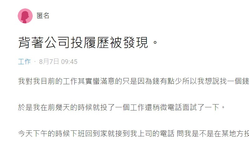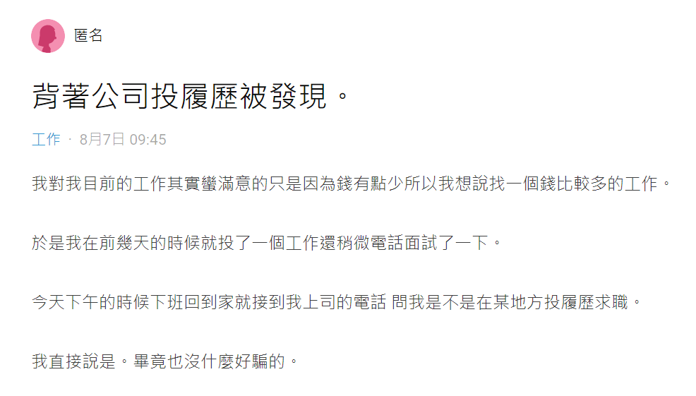 由於她不希望新公司聯絡她目前就職的公司,於是過程中對方詢問相關問題,她都回答不認識。但沒想到當晚回家,原PO竟接到上司的電話,詢問她是不是有到別間公司投履歷求職。