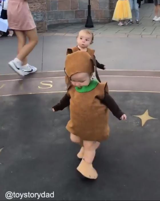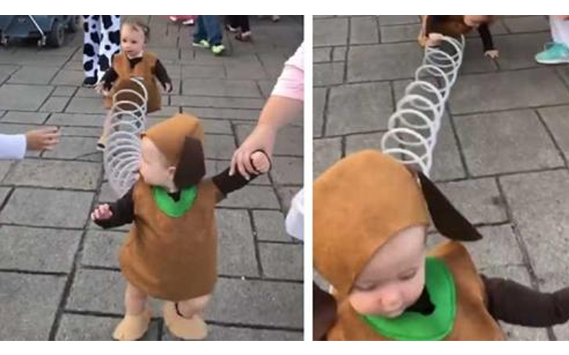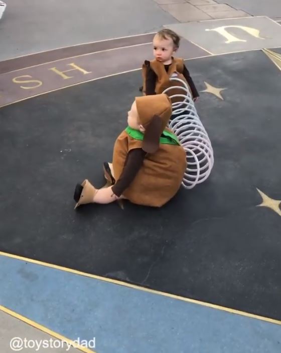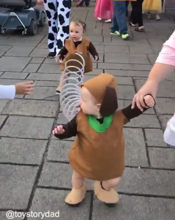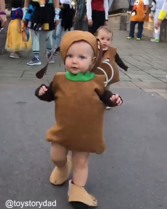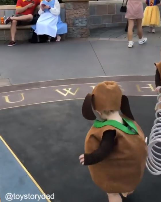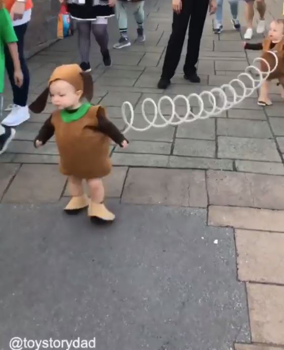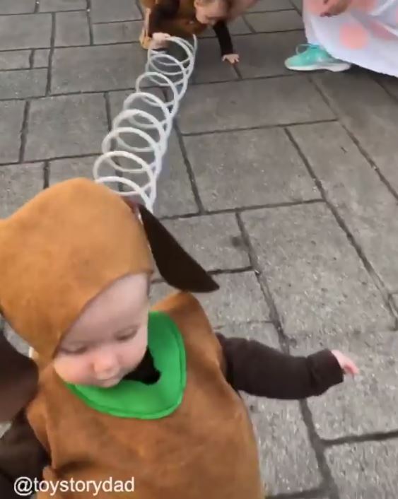 先前國外就有一位熱愛《玩具總動員》的奶爸塔克(Tucker),趁著帶寶寶去迪士尼參加萬聖節派對時,突發奇想將孩子cosplay成「彈簧狗」,而他的朋友也很熱情地派出自家寶寶充當「尾巴」,兩位寶寶組成了「最萌彈簧狗」組合,就這樣吸引所有遊客目光!