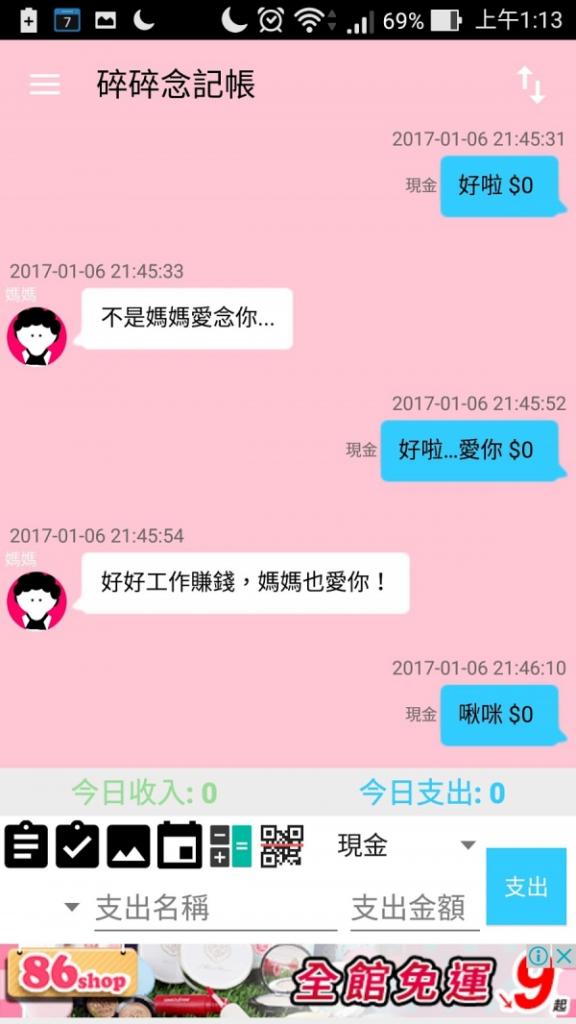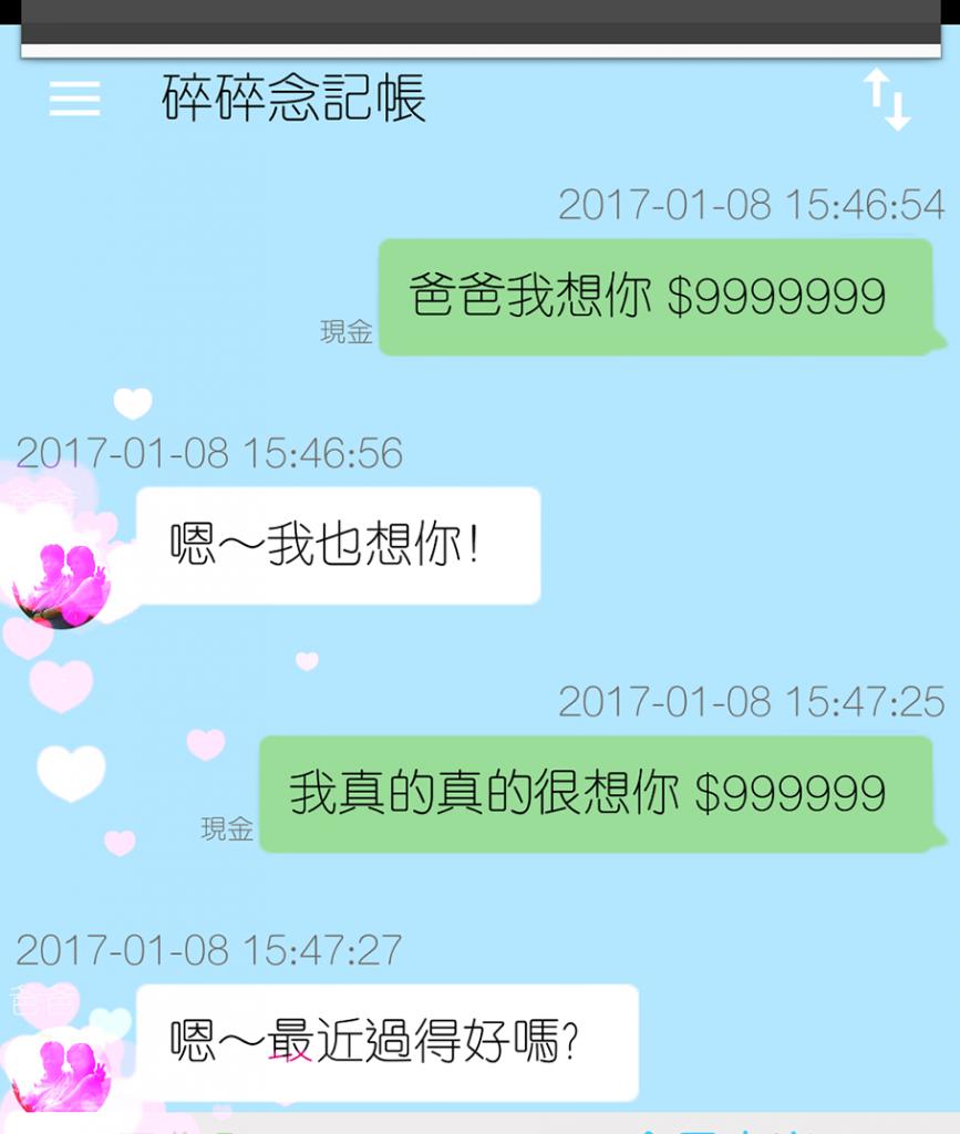 然後看到對話的進行我忍不住在支出打上我好想你 0元