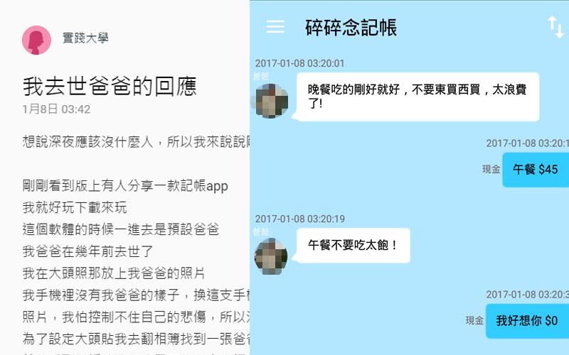 你能感受痛失親人有多痛嗎?最近網上流傳一個名為「碎碎念記帳」的APP,能夠調成爸爸模式,這樣一來電腦自動回復你的話就好像變成爸爸的叮嚀,這可讓許多網友傷心落淚了,這些不就是爸爸會說的話嗎?那麼的溫暖,又真實...