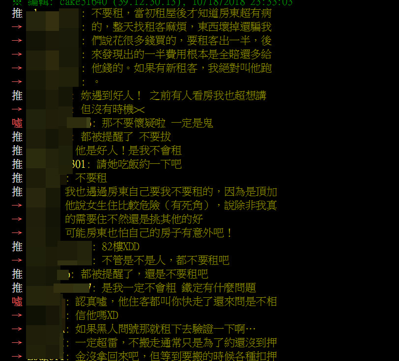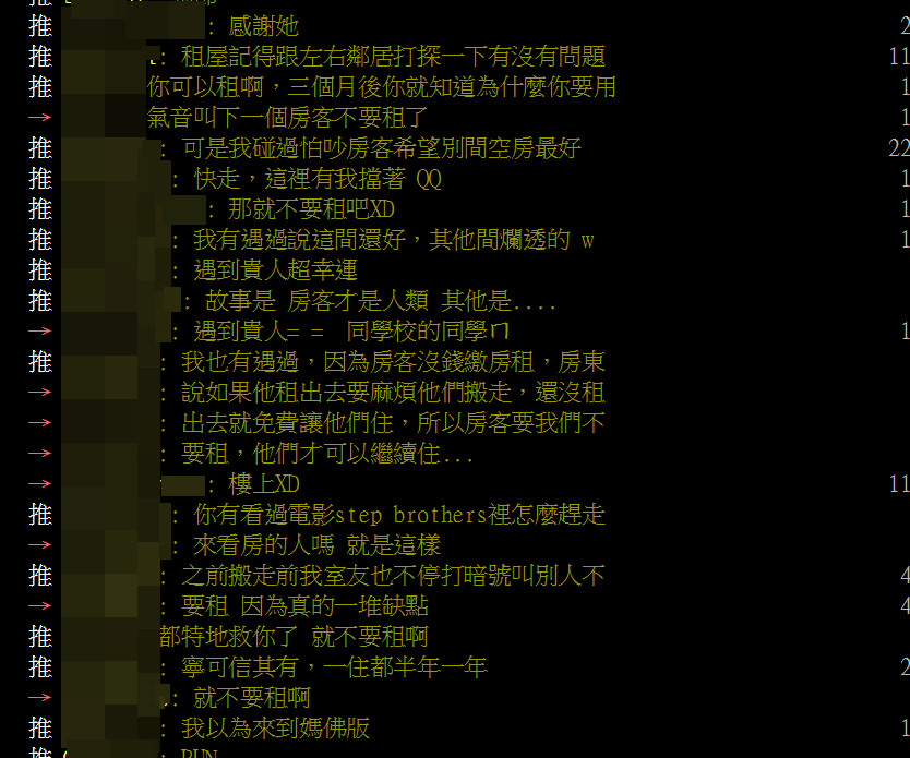 也有網友分享自己經驗說,「我有做過這種事,因為房東很機車,但又喜歡對想租屋的人裝的很和善」、「不要租,之前看房裡面的房客也提醒我不要租,浴室沒隔好可以看到隔壁的…」、「曾經一次下課回家遇到一對夫妻想租我家樓下,我說『房子怎樣不知道,但每個住進來的不到3個月就一定搬走』,他們面有難色的走了」。