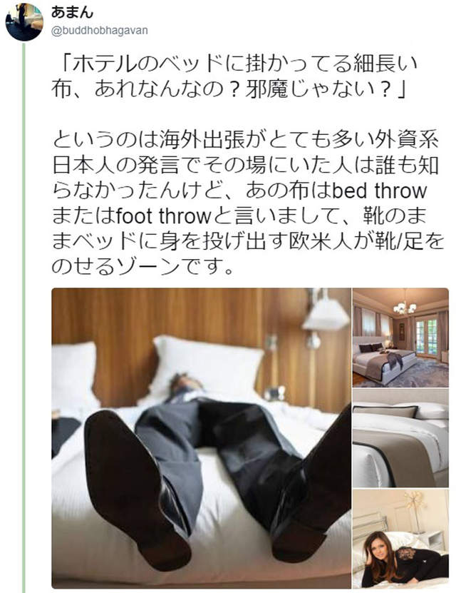 「很多日本人都說飯店床上那個細長的布很礙事,其實那個叫做bed throw或foot throw的布是讓歐美人穿著鞋子躺上床的」