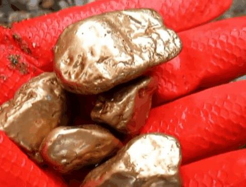 女子趕緊找來塑膠手套,在河灘挖了下去,果然看到了剛才的金色物體,她拿起來一看,乍一看像金子,仔細一看是石頭,女子順著河邊找了起來,一塊兩塊……女子足足找了十幾塊這樣的金色石頭,大小不一,形狀各異。