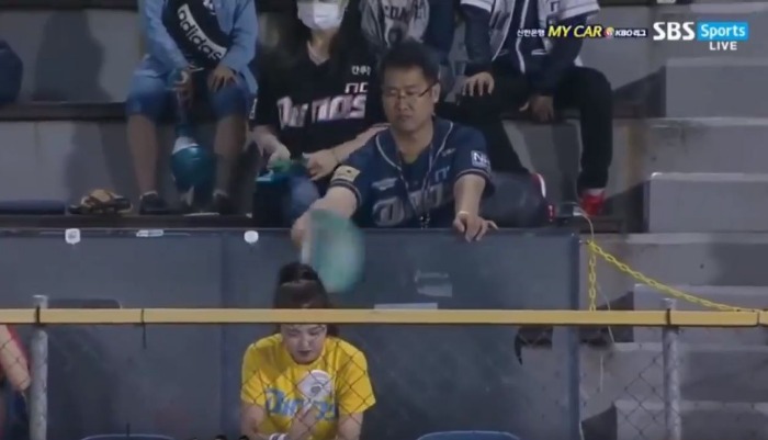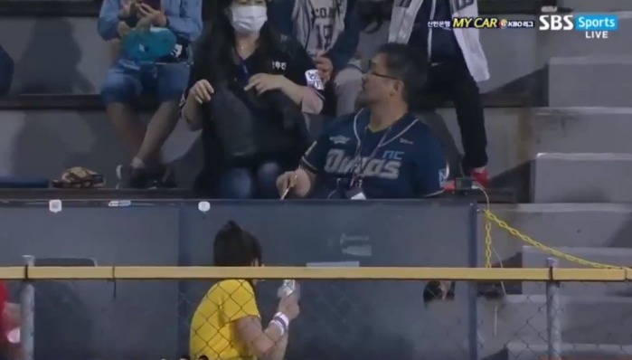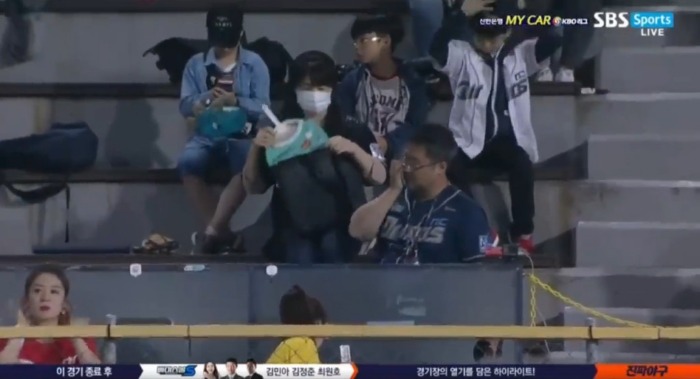 男球迷一邊幫正妹搧風的同時,還不忘把頭稍微撇一邊,原來是在觀察坐在身後的老婆有沒有發現…..小編只能說光天化日之下,你這樣做真的很有勇氣XD