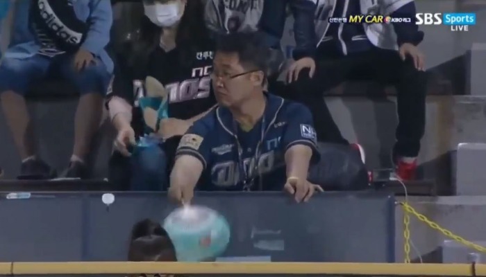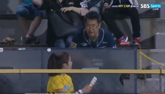 把妹神器瞬間被沒收,這下男球迷只能尷尬地搔搔臉,默默結束和正妹互動的機會。這整段過程都被拍了下來,男球迷也成為網路上的話題人物。