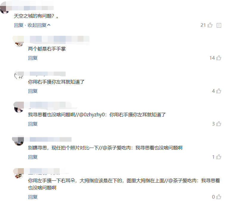 《天空之城》的這個動作比較複雜,大家可以親自嘗試一下,看看兩隻手的掌心都面向後腦勺的時候,大拇指的朝向應該是在哪邊。
