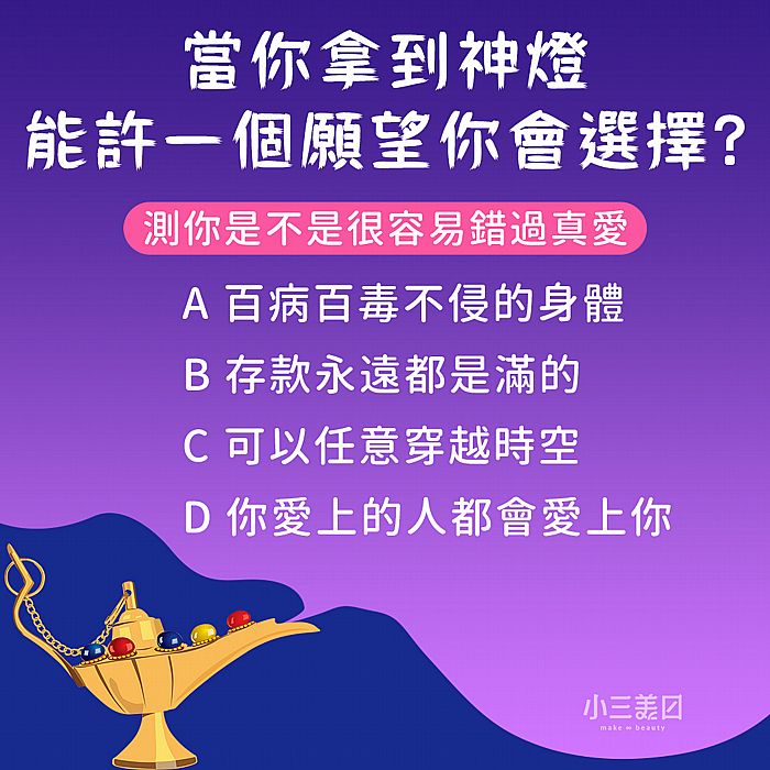 選擇『你愛上的人都會愛上你』的你是個目標蠻明確的類型,因為你很理性,通常都能分辨出誰適合、誰不適合,一旦要結婚,你就會挑出符合你的條件的人,所以錯過真愛的機率非常的低啦!