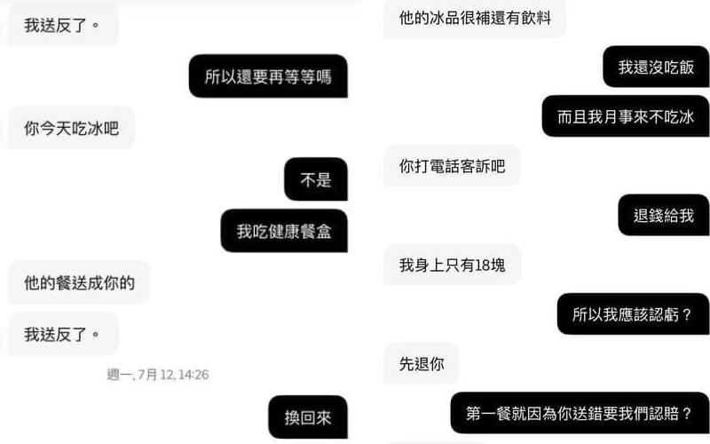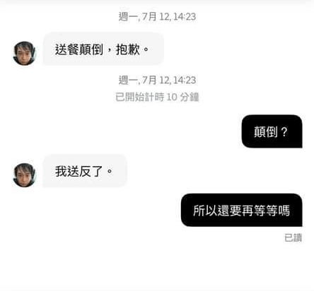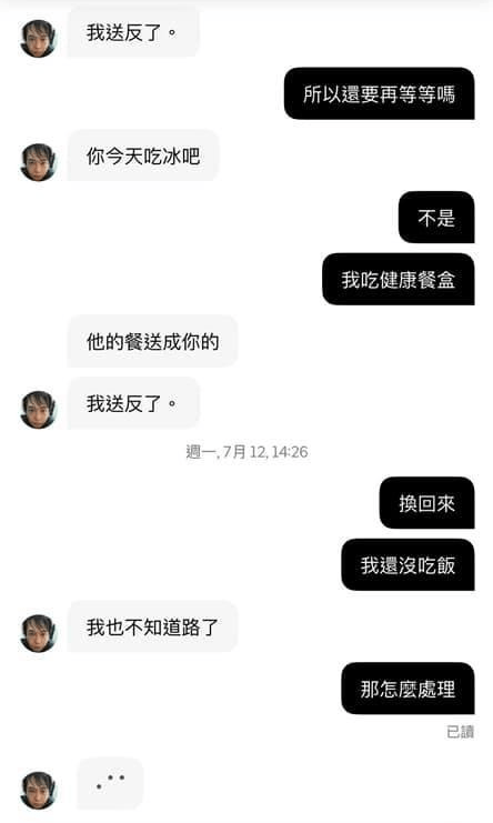 「我們昨天訂餐也送反,又ㄧ直連絡不上外送員,店家給我們另一個客人的電話,結果自己去交換回來。」