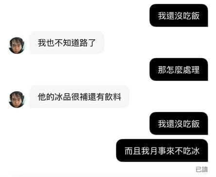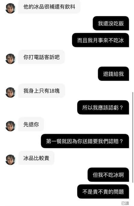 這到底是怎樣的操作模式,原po拒絕外送員,表示自己是吃健康餐盒的,結果沒想到外送員竟然回說『他的冰很補的!』,搞得原po忍不住直接說自己生理期,不能吃冰,最後外送員就表示那去客訴吧!會先退原po18元,可是末了又補了一句『他的冰比較貴!』